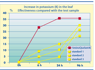 This had been demonstrated in several tests analyzing the potassium content after applying several solutions containing potassium, where it has been observed that there is a faster absorption in the plants treated with AminoQuelant-K.
